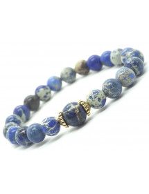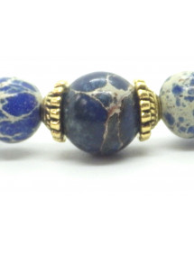 Eine prächtige handwerkliche Kreation von ThurColas Creation. Dies ist ein Damenarmband aus natürlichen blauen kaiserlichen Jaspisperlen (Halbedelstein), verziert mit goldenen Metallbechern. Alles ist auf einem hochwertigen elastischen Faden montiert. Stil: Klassisch, schick, Ethnisch, Böhmisch. Länge: 19 cm. Perlen: 10 mm. Materialien: Blauer Kaiserjaspis (Halbedelstein), Goldmetall. Farbe: Blau, Weiß. Metallfarbe: Gold