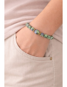 Damenarmband aus grün und schwarz getönten weißen Jadeperlen und tibetischen Perlen aus goldfarbenem Metall
