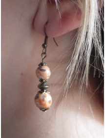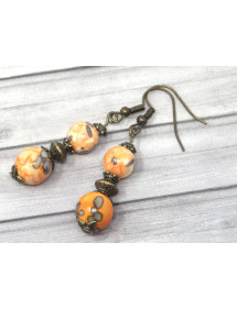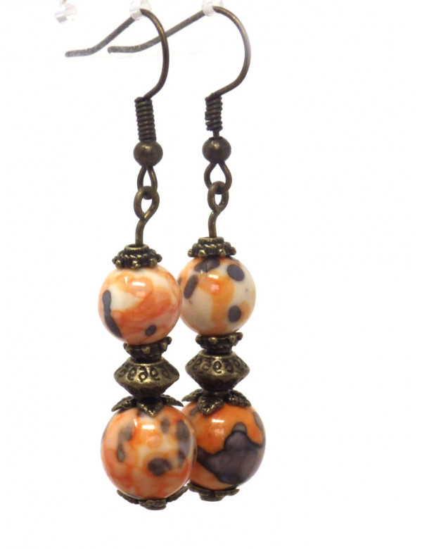 Hängende Ohrringe aus Bronze mit weißen Jadeperlen in Orange und Schwarz