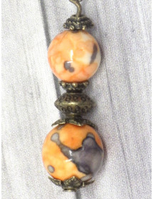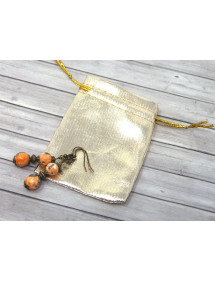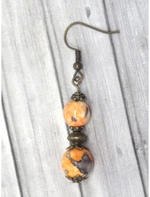 Adorables boucles d'oreilles de fabrication artisanale présentée par ThurColas Création. Très élégantes, ces boucles d'oreilles sont constituées de perles de jade blanc reconstitué teintées en orange et noir, agrémentées de perles en bronze. Le tout est monté sur des tiges et crochets en bronze. Style : Classique chic, Ethnique, Bohême, tribal, gypsy Crochet : French Hauteur : 50 mm Perles : 10 mm, 8 mm Matériaux : Jade blanc reconstitué et teinté, bronze Couleur : Orange, noir Couleur du métal : Bronze antique Nos perles sont en Jade blanc reconstitué teintées en orange et noir et assemblées sur une tige en bronze antique. Le procédé de teinture des pierres étant aléatoire, il peut y avoir de légères différences avec le modèle présenté, chaque modèle est de fait unique. Ce bijou est livré avec une pochette cadeau de couleur dorée gratuite.