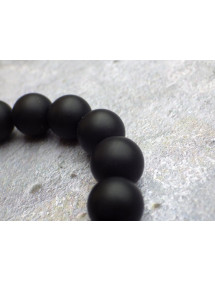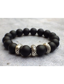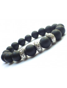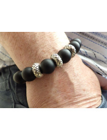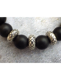 Prächtiges Armband für Herren aus Halbedelstein. Dieses sorgfältig in unseren Werkstätten in Frankreich gefertigte Armband besteht aus schwarzen Achatperlen eingerahmt von drei tibetischen Perlen aus einer antiken silberfarbenen Legierung. Stil: Ethnisch Stammes- Bohemien- Hippie-Chic Länge: 210 mm Perlen: 12 mm Materialien: Achat (Halbedelstein) Farbe: Schwarz Metallfarbe: Antiksilber