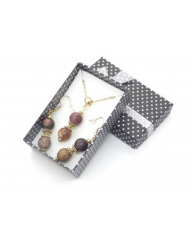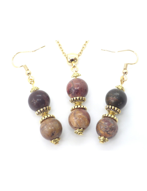 Prächtige handwerkliche Kreation von ThurColas Creation. Dabei handelt es sich um ein Schmuckset bestehend aus Ohrringen und einer Halskette aus Edelstahl mit Anhängern aus Naturperlen aus braunem Picasso-Jaspis (Halbedelstein), verziert mit Perlen, tibetischen Tellern und vergoldeten Metallbechern. Stil: Klassisch, schick, Ethnisch, Böhmisch. Höhe des Anhängers: 50 mm. Länge der Halskette: 45 cm. Höhe der Ohrringe: 50 mm. Haken: Französische Perlen: 10 mm. Materialien: brauner Picasso-Jaspis (Halbedelstein), vergoldeter Edelstahl, Gold Metallfarbe: Braun. Metallfarbe: Gold, Gold Unsere Perlen, die für die Anhänger dieses Schmucksets bestehend aus einer Halskette und einem Paar Ohrringen verwendet werden, bestehen aus echtem braunem Picasso-Jaspis und sind auf einem goldenen Metallstab montiert. Das Ganze ist an einer Kette und Haken aus vergoldetem Edelstahl befestigt. Da es sich beim Picasso-Jaspis um einen Naturstein handelt, ist jede Perle in der Farbe einzigartig, daher kann es zu geringfügigen Unterschieden zum vorgestellten Modell kommen. Tatsächlich ist jedes Modell ein Unikat. Dieses Schmuckstück wird mit einer kostenlosen Geschenktüte geliefert.