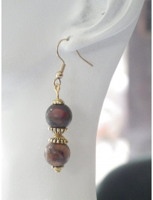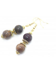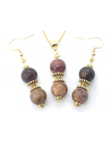 Prächtige handwerkliche Kreation von ThurColas Creation. Dabei handelt es sich um ein Schmuckset bestehend aus Ohrringen und einer Halskette aus Edelstahl mit Anhängern aus Naturperlen aus braunem Picasso-Jaspis (Halbedelstein), verziert mit Perlen, tibetischen Tellern und vergoldeten Metallbechern. Stil: Klassisch, schick, Ethnisch, Böhmisch. Höhe des Anhängers: 50 mm. Länge der Halskette: 45 cm. Höhe der Ohrringe: 50 mm. Haken: Französische Perlen: 10 mm. Materialien: brauner Picasso-Jaspis (Halbedelstein), vergoldeter Edelstahl, Gold Metallfarbe: Braun. Metallfarbe: Gold, Gold