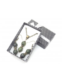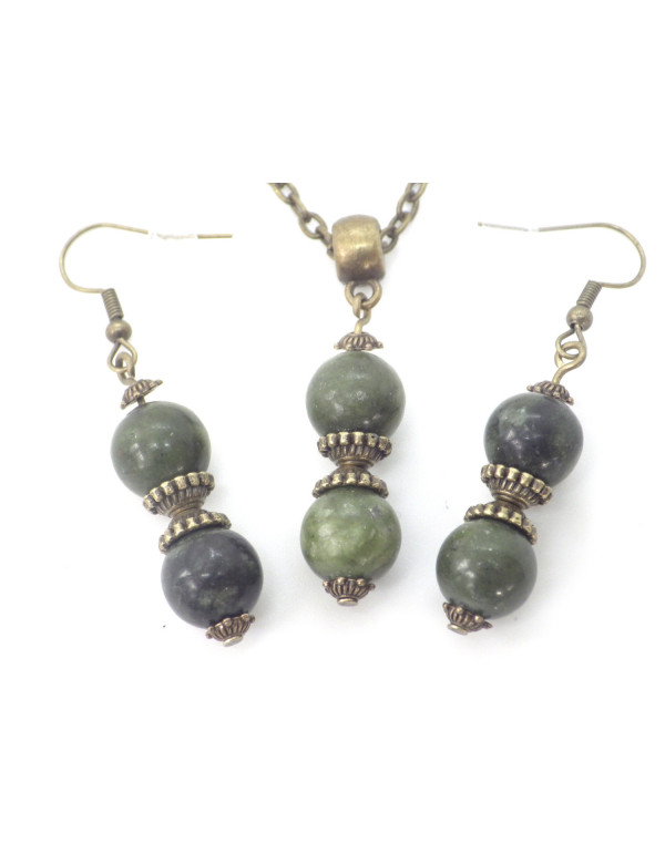 Wunderschöne handgefertigte Kreation präsentiert von ThurColas Création, bestehend aus einem Set von Ohrringen und einer Halskette aus Bronze mit Anhängern aus grünen Jadeperlen aus Taiwan (Halbedelstein) und tibetischen Perlen, verziert mit Bronzeteller. Stil: Klassisch, schick, ethnisch, Bohème Anhängerhöhe: 50 mm Kettenlänge: 45 cm Ohrringhöhe: 50 mm Haken: Französisch Perlen: 10 mm Materialien: grüne Jade aus Taiwan (Halbedelstein), Bronze Farbe: grün Metallfarbe: Bronze Die Perlen, die für die Anhänger dieses Schmucksets aus einer Halskette und einem Paar Ohrringe verwendet werden, bestehen aus echtem grünem Taiwan-Jade und sind auf einer Messingstange montiert. Das gesamte Schmuckstück ist an einer Bronzekette und Haken befestigt. Da Jade ein natürlicher Stein ist, ist jede Perle in der Farbe einzigartig, daher kann es leichte Unterschiede zum gezeigten Modell geben. Jedes Stück ist somit einzigartig. Dieser Schmuck wird mit einem kostenlosen Geschenkbeutel geliefert.
