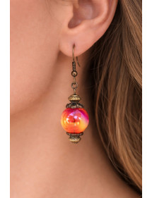 Diese eleganten handgefertigten Ohrringe verleihen Ihrem Outfit einen Hauch von Raffinesse. Ihr Vintage-Stil, veredelt durch eine rot-orange schillernde Acrylperle, macht sie ideal für besondere Anlässe oder um Ihrem Alltagsoutfit eine schicke Note zu verleihen. Jeder Ohrring verfügt über Messinghaken, kombiniert mit antik bronzefarbenen Messingperlen und -stäben für ein harmonisches und zeitloses Design. Perfekt ausbalanciert mit einer Gesamthöhe von 50 mm und einem Anhänger von 35 mm sind diese leichten und bequemen Ohrringe sowohl elegant als auch einfach zu tragen. Dieses Schmuckstück ist das Ergebnis französischer Handwerkskunst. Vollständig handgefertigt in meiner Werkstatt, spiegelt es die Liebe zum Detail und die Leidenschaft wider, einzigartige und elegante Stücke zu schaffen. Ein echtes Gütesiegel für Qualität und Authentizität. Gesamthöhe: 50 mm Anhängerhöhe: 35 mm Perle: 15 mm irisierendes Acryl Haken: Messing Metallstäbe und Perlen: Antikbronze-Messing Französische Handwerkskunst.