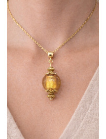 Dieses elegante handgefertigte Collier verleiht Ihrem Outfit einen Hauch von Raffinesse. Sein Vintage-Stil, veredelt durch eine goldene Lampwork-Glasperle, die ein Silberblatt umgibt, macht es ideal für besondere Anlässe oder um Ihrem Alltagslook eine schicke Note zu verleihen. Dieses Collier und sein Verschluss bestehen aus goldplattiertem Edelstahl, kombiniert mit vergoldeten Messingperlen und -stäben für ein harmonisches und zeitloses Design. Perfekt ausbalanciert mit einer 45 cm langen Kette und einem 35 mm Anhänger, ist dieses leichte und bequeme Schmuckstück sowohl elegant als auch einfach zu tragen.