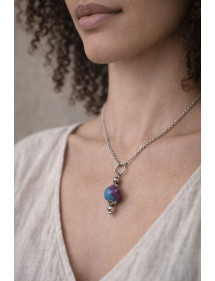 Diese elegante handgefertigte Halskette verleiht Ihrem Outfit einen Hauch von Raffinesse. Ihr Vintage-Stil, veredelt durch eine blaue, glasierte und perlmuttartige Glasperle, die ein Silberblatt umgibt, macht sie ideal für besondere Anlässe oder um Ihrem Alltag eine schicke Note zu verleihen. Diese Halskette und ihr Verschluss bestehen aus Edelstahl, kombiniert mit versilberten Messingperlen und -stäben, für ein harmonisches und zeitloses Design. Perfekt ausbalanciert mit einer 45 cm langen Kette und einem 35 mm Anhänger, sind diese leichten und bequemen Ohrringe darauf ausgelegt, sowohl elegant als auch einfach zu tragen zu sein. Dieses Schmuckstück ist das Ergebnis französischer Handwerkskunst. Vollständig von Hand in meinem Atelier gefertigt, spiegelt es die Liebe zum Detail und die Leidenschaft für die Schaffung einzigartiger und eleganter Stücke wider. Ein echtes Gütesiegel für Qualität und Authentizität. Kettenlänge: 45 cm Anhängerhöhe: 35 mm Perle: 14 mm glasiertes und perlmuttfarbenes Glas mit Silberfolie Haken: Edelstahl Metallstäbe und -perlen: Versilbertes Messing Französische Handwerkskunst.