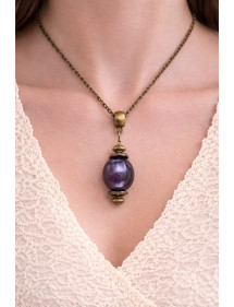 Diese elegante handgefertigte Halskette verleiht Ihrem Outfit einen Hauch von Raffinesse. Ihr Vintage-Stil, veredelt durch eine glänzende und perlmuttfarbene violette Glasperle, die ein Silberblatt umgibt, macht sie ideal für besondere Anlässe oder um Ihrem Alltag eine elegante Note zu verleihen. Diese Halskette und ihr Verschluss bestehen aus vergoldetem Edelstahl, kombiniert mit vergoldeten Messingperlen und -stäben, für ein harmonisches und zeitloses Design. Perfekt ausbalanciert mit einer 45 cm langen Kette und einem 35 mm Anhänger, sind diese leichten und bequemen Ohrringe so konzipiert, dass sie sowohl elegant als auch einfach zu tragen sind. Dieses Schmuckstück ist das Ergebnis französischer Handwerkskunst. Es wurde vollständig von Hand in meinem Atelier gefertigt und spiegelt die Liebe zum Detail und die Leidenschaft für die Schaffung einzigartiger und eleganter Stücke wider. Ein wahres Zeichen für Qualität und Authentizität. Kettenlänge: 45 cm Anhängerhöhe: 35 mm Perle: 14 mm Glas mit glasiertem und perlmuttfarbenem Effekt, verziert mit Silberblatt Haken: Vergoldeter Edelstahl Metallstangen und Perlen: Vergoldetes Messing Französische Handwerkskunst.
