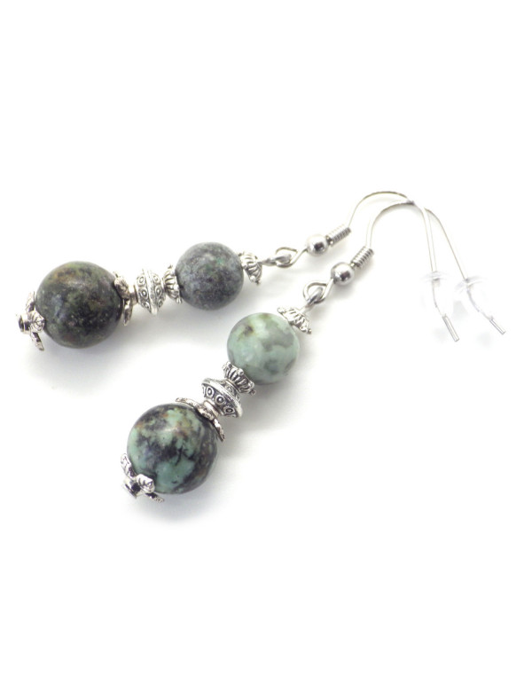 Boucles d'oreilles en acier inoxydable avec perles de turquoise naturelle verte et perles en laiton argenté