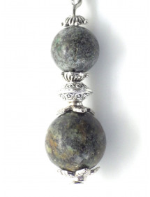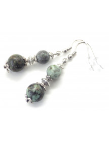 Très belle création artisanale présentée par ThurColas Création, il s'agit de boucles d'oreilles en acier inoxydable constituées de perles naturelles en Turquoise verte (pierre semi précieuse) agrémentées de perles tibétaines et coupelles en laiton argenté. Le tout est monté sur des crochets french en acier inoxydable. Parfaitement équilibrées avec une hauteur totale de 50 mm et un pendentif de 35 mm, ces boucles d’oreilles légères et confortables sont pensées pour être à la fois élégantes et faciles à porter. Style : Classique, chic, Ethnique, Bohême Crochet : French Hauteur : 50 mm Perles : 10 mm et 8 mm Matériaux : Turquoise verte (pierre semi précieuse), laiton, acier inoxydable Couleur : vert Couleur du métal : acier, argent