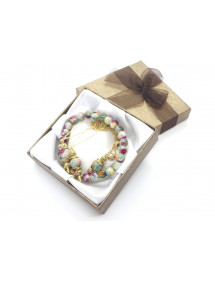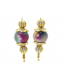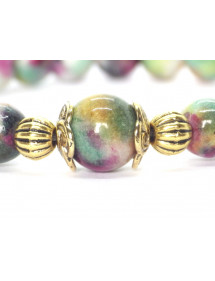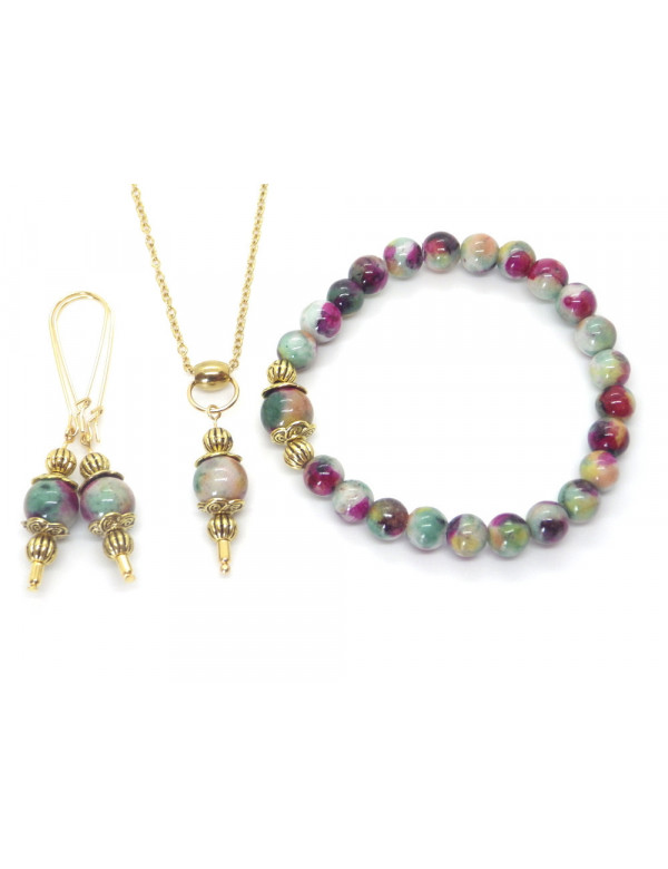 Wunderschönes Vintage-Armband, Halskette und Ohrringe aus vergoldetem Edelstahl und vergoldetem Metall. Dieses handgefertigte Schmuckset, bestehend aus einem Armband, einer Halskette und einem Paar kreolischer Ohrringe, ist sorgfältig hergestellt und besteht aus weißer Jade, die in Grün, Rot und Braun getönt ist (Halbedelstein), aus vergoldetem Edelstahl und goldfarben Metall. Alles ist auf einem hochwertigen, widerstandsfähigen Gummiband sowie einer Kette und Creolen aus vergoldetem Edelstahl montiert. Stil: Böhmen, Vintage Verschluss: Karabiner Länge der Halskette: 45 cm Länge des Armbands: 19 cm Höhe der Ohrringe: 70 mm Perlen: Weiße Jade, grün, rot und braun gefärbt (Halbedelstein) Materialien: Gefärbte weiße Jade in Grün (Halbedelstein) Edelstein) vergoldeter Edelstahl und vergoldetes Metall Farbe: Grün, Rot, Braun Metallfarbe: Gold, Gold