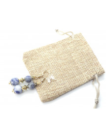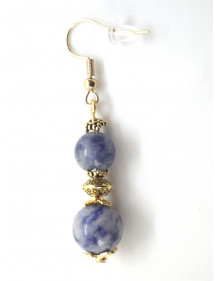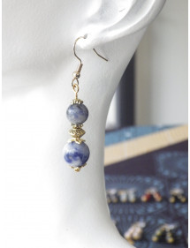 Es handelt sich um vergoldete Ohrringe aus Edelstahl aus natürlichem blauem Jaspis (Halbedelstein), die mit tibetischen Perlen und goldenen Messingperlen verziert sind. Das Ganze ist auf vergoldeten französischen Haken aus Edelstahl montiert. Mit einer Gesamthöhe von 50 mm und einem 35-mm-Anhänger sind diese leichten und bequemen Ohrringe perfekt ausbalanciert und so konzipiert, dass sie sowohl stilvoll als auch einfach zu tragen sind.