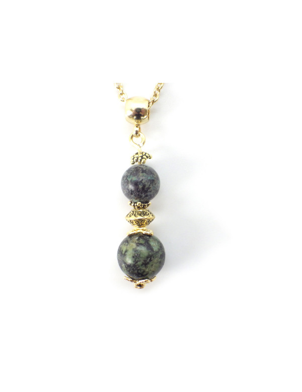 Es handelt sich um eine wunderschöne handgefertigte Kreation, die von ThurColas Création präsentiert wird, eine vergoldete Halskette aus Edelstahl mit einem Anhänger aus natürlichen grünen Türkisperlen (Halbedelstein), die mit tibetischen Perlen und goldenen Messingperlen verziert sind.