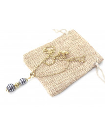 Es handelt sich um eine wunderschöne, handgefertigte Kreation, die von ThurColas Création präsentiert wird, eine vergoldete Halskette aus Edelstahl mit einem Anhänger aus natürlichem schwarzem Hämatit und Chromperlen (Halbedelstein), der mit tibetischen Perlen und goldenen Messingperlen verziert ist.