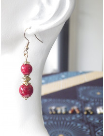 Es handelt sich um ein Schmuckset, das von ThurColas Création präsentiert wird und aus Ohrringen und einer Halskette aus vergoldetem Edelstahl besteht, mit Anhängern aus türkisfarbenen Perlen, die mit Harz rekonstituiert und rot gefärbt wurden, verziert mit tibetischen Perlen und goldenen Messingperlen. Mit einer Gesamthöhe von 50 mm und einem 35-mm-Anhänger sind diese leichten und bequemen Ohrringe perfekt ausbalanciert und so konzipiert, dass sie sowohl stilvoll als auch einfach zu tragen sind. Jede Halskette besteht aus einer 45 cm langen Kette und einem Karabinerverschluss aus vergoldetem Edelstahl, dazu ein 35-mm-Anhänger, der aus einem vergoldeten Messingpfosten und Perlen sowie zwei Perlen von 10 und 8 mm besteht. Stil: Klassisch, schick, Ethnisch, Böhmisch Anhängerhöhe: 35 mm Länge der Halskette: 45 cm Höhe Ohrringe: 50 mm Haken: Französische Perlen: 10 mm und 8 mm Materialien: Rot versetztes Türkis, goldenes Messing, vergoldeter Edelstahl Farbe: rot Metallfarbe: Gold, Gold