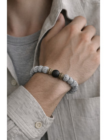 Sehr schönes Herrenarmband, das mit Sorgfalt in unseren Werkstätten in Frankreich hergestellt wird. Dieses Armband besteht aus wunderschönen natürlichen grauen Lavasteinperlen, schwarzen Achatperlen und sehr hübschen tibetischen Perlen aus antikem Bronzemessing. Es ist die Stärke des Metalls, die bei diesem Modell durchscheint. Stil: Ethnisch, Bohemien, Stammes, Zen Länge: 210 mm Perlen: 10 mm Materialien: Lavastein (Halbedelstein), Schwarzer Achat Messing Farbe: Grau, Schwarzes Metall Farbe: Antikbronze