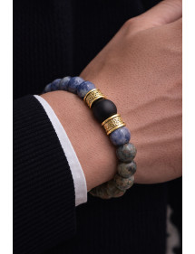 Sehr schönes Herrenarmband, das mit Sorgfalt in unseren Werkstätten in Frankreich hergestellt wird. Dieses Armband besteht aus wunderschönen natürlichen blauen Jaspisperlen, schwarzen Achatperlen und sehr hübschen tibetischen Perlen aus goldenem Messing. Es ist die Stärke des Metalls, die bei diesem Modell durchscheint. Stil: Ethnisch, Bohemien, Tribal, Zen Länge: 210 mm Perlen: 10 mm und 12 mm Materialien: Jaspis (Halbedelstein), schwarzer Achat Messing Farbe: blau, schwarz Metallfarbe: Gold