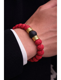 Sehr schönes Herrenarmband, das mit Sorgfalt in unseren Werkstätten in Frankreich hergestellt wird. Dieses Armband besteht aus wunderschönen natürlichen roten Lavasteinperlen, schwarzen Achatperlen und sehr hübschen tibetischen Perlen aus goldenem Messing. Es ist die Stärke des Metalls, die bei diesem Modell durchscheint. Stil: Ethnisch, Bohème, Tribal, Zen Länge: 210 mm Perlen: 10 mm und 12 mm Materialien: Lavastein (Halbedelstein), Schwarzer Achat Messing Farbe: Rot, Schwarzes Metall Farbe: Golden