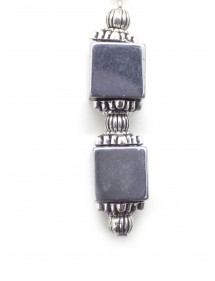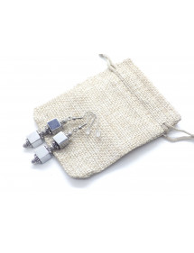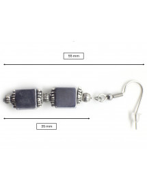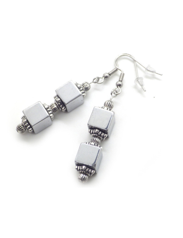 Die Ohrringe sind insgesamt 55 mm lang, der Perlenbesatz misst 35 mm. Sie sind mit zwei quadratischen Hämatitperlen in Chromfarbe besetzt – einem Naturstein aus Brasilien, der für seinen metallischen Glanz und seine beruhigende Dichte bekannt ist. Die silberplattierten Messing-Perlenkappen zeigen ein fein gearbeitetes Perlenmuster, das jede Perle einrahmt und hervorhebt. Die standardmäßigen Edelstahl-Hakenverschlüsse gewährleisten Langlebigkeit und optimalen Tragekomfort. Dieses Design wird, wie alle unsere Kreationen, vollständig in unserer Werkstatt in Anjou, Frankreich, handgefertigt.