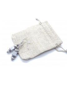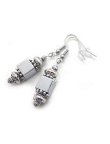 Diese eleganten, handgefertigten Ohrringe vereinen eine quadratische, verchromte Hämatitperle mit großen, filigranen Fassungen aus versilbertem Messing und ergeben so ein strahlendes und raffiniertes Schmuckstück. Der Kontrast zwischen dem metallischen Glanz des Steins und den filigranen Details des Metalls verleiht ihnen einen modernen und zugleich zeitlosen Stil. Mit einer Gesamtlänge von 45 mm sind sie sowohl für den Alltag als auch für besondere Anlässe bestens geeignet. Jedes Paar wird in unserer Werkstatt in Anjou sorgfältig von Hand gefertigt, was eine hochwertige, handwerkliche Verarbeitung garantiert.