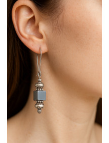 Diese verchromten Hämatit-Ohrringe bestechen durch ihre wunderschönen, durchbrochenen Fassungen aus versilbertem Messing und die länglichen Edelstahlreifen. Ihr Design unterstreicht den metallischen Glanz des Hämatits und verleiht ihnen eine raffinierte und zeitlose Eleganz. Mit einer Gesamtlänge von 60 mm verlängern sie das Dekolleté optisch und passen sowohl zu klassischen als auch zu modernen Stilen. Jedes Stück wird in unserer Werkstatt in Anjou handgefertigt, was eine sorgfältige Verarbeitung und handwerkliche Qualität garantiert. Diese Ohrringe haben eine Gesamtlänge von 60 mm, davon 25 mm Perlen. Sie bestehen aus quadratischen Hämatitperlen, einem aus Brasilien stammenden Stein, der für seinen metallisch-grauen Farbton und seinen dezenten Glanz geschätzt wird. Die großen, durchbrochenen Fassungen aus versilbertem Messing verleihen dem Schmuckstück Struktur und Charakter. Die Verschlüsse sind längliche Edelstahlringe, die robust, komfortabel und hypoallergen sind. Handgefertigt in unserer Werkstatt in Anjou, Frankreich.