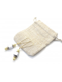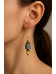 Diese Ohrringe vereinen die metallische Kraft von natürlichem Hämatit mit dem warmen Glanz von Gold. Jedes Schmuckstück besteht aus 10 mm großen Hämatitwürfeln, die von geriffelten Perlen und fein gearbeiteten, vergoldeten Messingfassungen eingefasst sind. Zarte, längliche Creolen aus vergoldetem Edelstahl runden das elegante Design ab und vereinen so Langlebigkeit mit zeitloser Eleganz. Der Kontrast zwischen dem spiegelnden Grau des Hämatits und den goldenen Reflexen des Metalls erzeugt eine raffinierte Balance, die das Gesicht perfekt zum Strahlen bringt. In unserer Werkstatt in Anjou handgefertigt, zeugen diese Ohrringe von sorgfältiger Handwerkskunst und einem Sinn für schlichte, zeitlose Harmonie. Ein einzigartiges Schmuckstück, mit Liebe zum Detail gefertigt, das sowohl Ihre Alltagsoutfits als auch formelle Anlässe perfekt ergänzt. Diese Ohrringe bestehen aus 10 mm großen, natürlichen Hämatit-Kugeln, kombiniert mit geriffelten Perlen und dekorativen, vergoldeten Messingkappen. Die länglichen Ohrhaken im Creolen-Stil sind aus vergoldetem Edelstahl gefertigt und garantieren Langlebigkeit und hohen Tragekomfort. Jeder Ohrring wird in unserer französischen Werkstatt in Anjou handgefertigt.