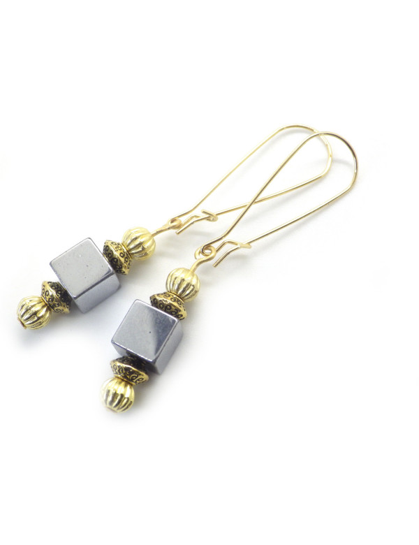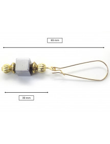 Diese Ohrringe vereinen die metallische Kraft von natürlichem Hämatit mit dem warmen Glanz von Gold. Jedes Schmuckstück besteht aus 10 mm großen Hämatitwürfeln, die von geriffelten Perlen und fein gearbeiteten, vergoldeten Messingfassungen eingefasst sind. Zarte, längliche Creolen aus vergoldetem Edelstahl runden das elegante Design ab und vereinen so Langlebigkeit mit zeitloser Eleganz. Der Kontrast zwischen dem spiegelnden Grau des Hämatits und den goldenen Reflexen des Metalls erzeugt eine raffinierte Balance, die das Gesicht perfekt zum Strahlen bringt. In unserer Werkstatt in Anjou handgefertigt, zeugen diese Ohrringe von sorgfältiger Handwerkskunst und einem Sinn für schlichte, zeitlose Harmonie. Ein einzigartiges Schmuckstück, mit Liebe zum Detail gefertigt, das sowohl Ihre Alltagsoutfits als auch formelle Anlässe perfekt ergänzt.
