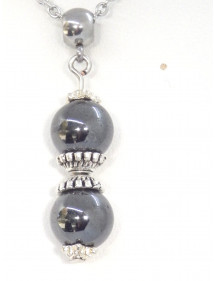Eine prächtige handwerkliche Kreation von ThurColas Creation. Es handelt sich um eine Halskette aus Edelstahl mit einem Anhänger aus natürlichen schwarzen Hämatitperlen (Halbedelstein), verziert mit tibetischen Perlen und silbernen Metallbechern. Stil: Klassisch, schick, Ethnisch, Böhmisch. Höhe des Anhängers: 50 mm. Länge der Halskette: 45 cm. Perlen: 10 mm. Materialien: Schwarzer Hämatit (Halbedelstein), Edelstahl, silbernes Metall. Farbe: Schwarz. Metallfarbe: Silber, Stahl