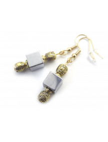 13,50 €Diese Ohrringe vereinen die metallische Tiefe von natürlichem Hämatit mit dem edlen Glanz von Gold. Die silbergrauen Hämatitwürfel werden von Perlen und vergoldeten Messingelementen eingefasst, die ihren Glanz unterstreichen. Die 18-karätig vergoldeten Edelstahlhaken verleihen ihnen eine zeitlose, hypoallergene Eleganz. Ein modernes und strahlendes Schmuckstück, vollständig handgefertigt in unserer Werkstatt in Anjou.