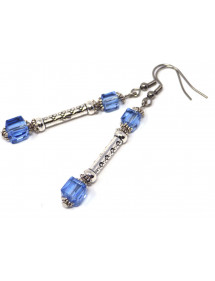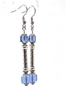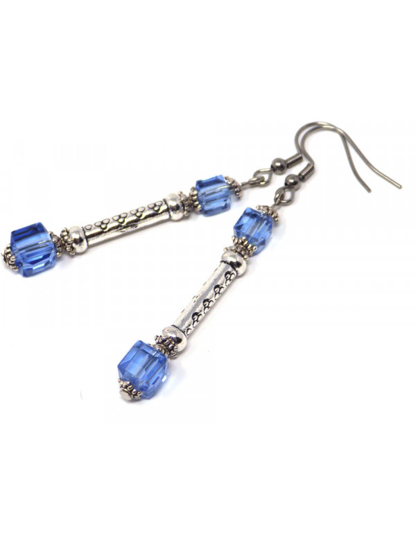 Schöne baumelnde Ohrringe im Stil des blauen Himmels für elegante Frauen. Dieses kostbare Juwel besteht aus himmelblauen, quadratischen Perlen. Die Haken sind aus Edelstahl, die Stange, die Säulen und die Becher sind aus versilbertem Messing. Die dominierende Farbe der Ohrringe ist blau. Die Glasperlen betragen 8 mm und 6 mm, die Höhe der Ohrringe beträgt 65 mm.