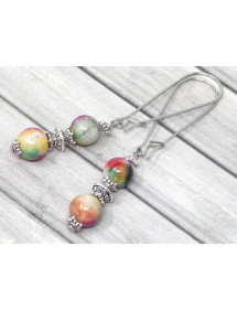 Schöne Vintage Edelstahl Ohrringe. Diese handgefertigten Ohrringe werden mit Sorgfalt hergestellt und bestehen aus natürlicher roter, grüner und weißer Jade sowie versilberten Metallperlen. Das Ganze ist auf ausgefallenen Reifen aus Edelstahl montiert. Stil: Böhmen, Vintage Haken: Kreolen Höhe: 60 mm Perlen: 8 mm Materialien: Naturjade (Halbedelstein) und Edelstahl Farbe: rot, grün und weiß Metallfarbe: Stahl, Silber Dieses Juwel besteht aus echten Jadeperlen, Edelstein mit schützenden Eigenschaften und tibetischen Perlen aus versilbertem Metall. Das Ganze ist auf einem versilberten Metallnagel montiert. Dieses Juwel wird mit einer hervorragenden Geschenkverpackung aus Textil geliefert.