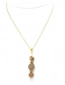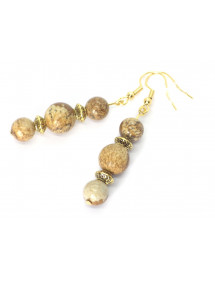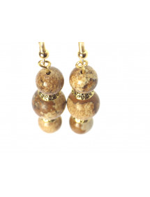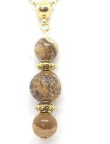 Sehr schönes handgefertigtes Schmuckset präsentiert von ThurColas Création. Dieses sehr elegante Set aus Halskette und Ohrringen besteht aus braunen Jaspisperlen (Halbedelstein) und goldenen Metallperlen. Die Anhänger sind an einer goldenen Edelstahlkette und Haken befestigt. Stil: Classic Chic, Ethno, Böhmen Halskettenlänge: 55 cm Anhängerhöhe: 35 mm Perlen: 10 mm, 8 mm Materialien: brauner Jaspis (Halbedelstein), goldenes Metall und goldener Edelstahl Farbe: braun Metallfarbe: Gold