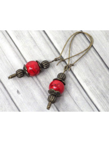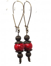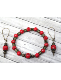 Wunderschönes Vintage Armband und Ohrringe in antiker Bronze. Dieses handgefertigte Schmuckset, bestehend aus einem Armband und kreolischen Ohrringen, wird mit Sorgfalt hergestellt und besteht aus rotem, rekonstituiertem Türkis und antiker Bronze. Alles ist auf einem qualitätsbeständigen elastischen und ausgefallenen antiken Bronzebügel montiert. Stil: Böhmen, Vintage Hakenohrringe: Kreolisch Höhe der Ohrringe: 60 mm Länge des Armbands: 19 cm Perlen: rot rekonstituiertes Türkis (Halbedelstein) Materialien: antike Bronze Farbe: rot Metallfarbe: antike Bronze