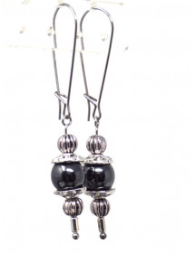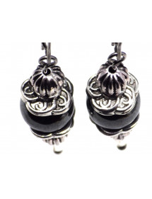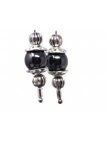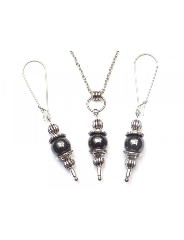 Hermoso collar gargantilla y aretes vintage engastados en acero inoxidable. Hecho a mano, este conjunto de joyas está hecho con cuidado y compuesto de hematita negra (piedra semipreciosa), metal plateado y acero inoxidable. Todo está montado en una cadena de acero inoxidable para el collar y en aros de acero inoxidable para los pendientes. Estilo: Bohemia, Vintage Cierre: pinza de langosta, pinza de langosta Longitud del collar: 45 cm Altura de los pendientes: 70 mm Cuentas: hematita negra (piedra semipreciosa) Materiales: metal plateado y acero inoxidable Color: negro Color del metal: acero, plata