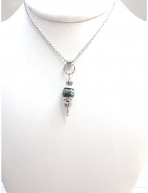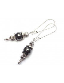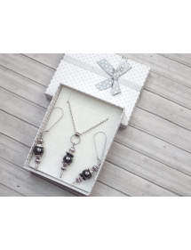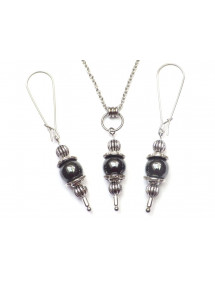 Hermoso collar gargantilla y aretes vintage engastados en acero inoxidable. Hecho a mano, este conjunto de joyas está hecho con cuidado y compuesto de hematita negra (piedra semipreciosa), metal plateado y acero inoxidable. Todo está montado en una cadena de acero inoxidable para el collar y en aros de acero inoxidable para los pendientes. Estilo: Bohemia, Vintage Cierre: pinza de langosta, pinza de langosta Longitud del collar: 45 cm Altura de los pendientes: 70 mm Cuentas: hematita negra (piedra semipreciosa) Materiales: metal plateado y acero inoxidable Color: negro Color del metal: acero, plata Nuestras cuentas están hechas de hematita genuina y ensambladas en una varilla de acero inoxidable, la hematita es una piedra natural, cada cuenta es única en color por lo que puede haber ligeras diferencias con el modelo presentado, cada modelo es de hecho único. Esta joya se entrega en una caja de regalo.