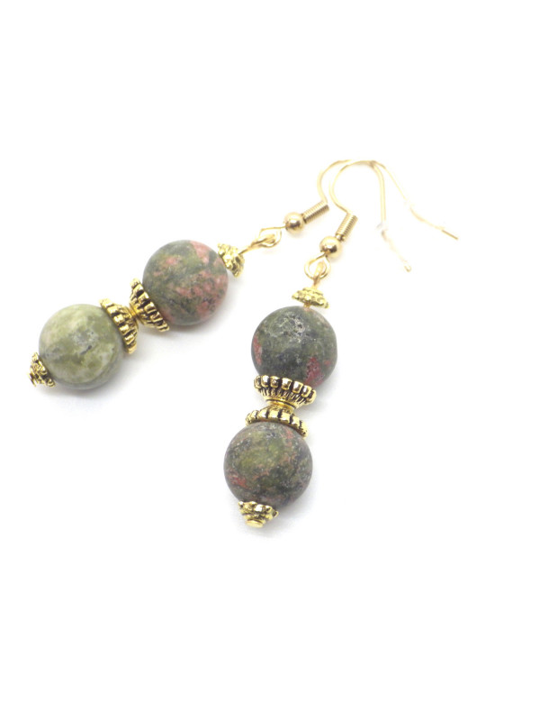 Magnífica creación artesanal presentada por ThurColas Creation, se trata de unos pendientes elaborados con perlas de Unakita (piedra semipreciosa) de color verde natural adornados con perlas tibetanas y copas de metal dorado. Todo está montado sobre ganchos franceses de acero inoxidable bañados en oro. Estilo: Clásico, chic, Étnico, Bohemio Gancho: Francés Alto: 50 mm Cuentas: 10 mm Materiales: Unakita verde (piedra semipreciosa), acero inoxidable, metal dorado Color: verde Color del metal: Dorado Nuestras cuentas están hechas de Unakita verde real y ensambladas sobre una varilla de metal dorado y ganchos de acero inoxidable chapados en oro, siendo la Unakita una piedra natural, cada cuenta es única en color por lo que puede haber ligeras diferencias con el modelo presentado, cada modelo está en hecho único. Esta joya viene con una bolsa de regalo gratuita.