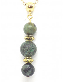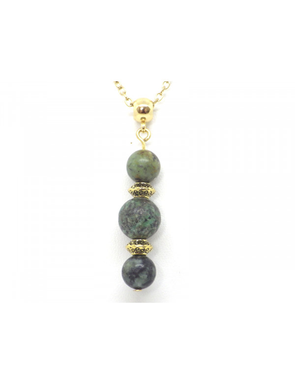 Muy hermoso collar hecho a mano presentado por ThurColas Création. Muy elegante, este collar está hecho de cuentas de turquesa natural verde (piedra semipreciosa) y cuentas tibetanas en metal dorado. Todo está montado en una cadena de acero inoxidable. Estilo: Chic clásico, Étnico, Bohemio Broche: pinza de langosta Longitud: 55 cm Cuentas: 10 mm, 8 mm Materiales: turquesa natural verde (piedra semipreciosa), metal y acero inoxidable dorado Color: Verde Color del metal: Oro Nuestras cuentas están hechas de turquesa natural verde (piedra semipreciosa) y ensambladas en una varilla de metal dorado y una cadena de acero inoxidable, la turquesa es una piedra natural, cada cuenta es única en color por lo que puede haber ligeras diferencias con el modelo presentado, cada modelo es único. Esta joya viene con una bolsa de regalo de color dorado.