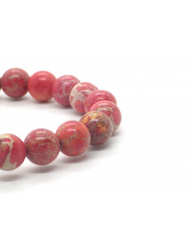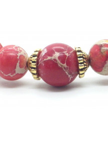 Magnífica creación artesanal presentada por ThurColas Création, se trata de una pulsera para mujer realizada con cuentas de jaspe imperial rojo natural (piedra semipreciosa) decorada con copas de metal dorado. Todo está montado sobre un hilo elástico de calidad. Estilo: Clásico, chic, Étnico, Bohemio Longitud: 19 cm Cuentas: 10 mm Materiales: jaspe imperial rojo (piedra semipreciosa), metal dorado Color: rojo, blanco Color del metal: Oro
