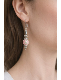 Preciosos pendientes colgantes Hippie Chic fabricados en Francia con auténticas cuentas de jade blanco teñidas de verde y rosa y cuentas tibetanas. Todo es muy chic seguro que te enamorará. Todo está montado sobre ganchos franceses de acero inoxidable. Estilo: Bohemio Clásico Chic Gancho: Francés Alto: 40 mm Cuentas: Jade natural teñido (8 mm) cuentas tibetanas en plata antigua Materiales: Jade natural acero inoxidable y latón plateado Color: Blanco verde y rosa Color del metal: Plata antigua