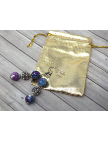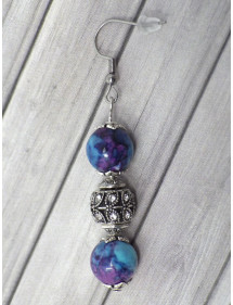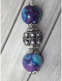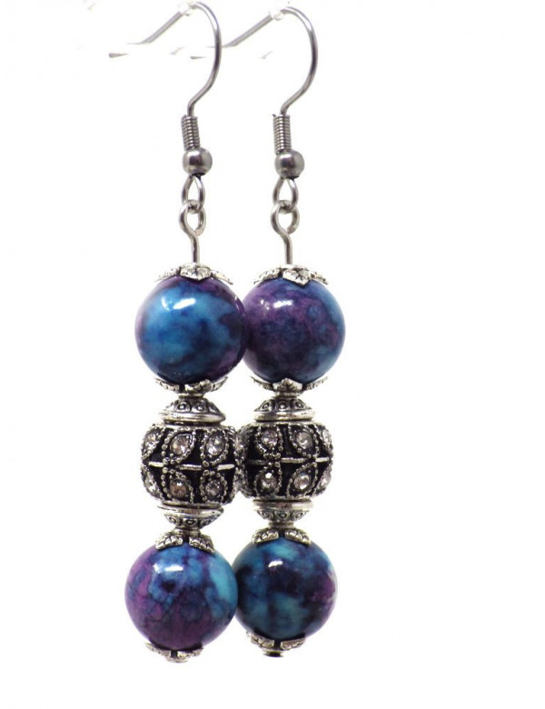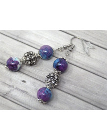 Pendientes hermosas firmados Thurcolas, hechos con cuidado en nuestros talleres en Francia. Estos pendientes están hechos de cuentas de jade 'reconstituidos con dos hermosas perlas de tibetanos con cristales. Estilo: étnico, tribal, bohemio, hippie elegante, con clase, clásico. Altura: 60 mm. Los granos: 10 mm. Materiales: cristal de jade reconstituido. Color: púrpura, azul. Color del metal: plata antigua
