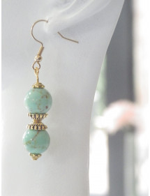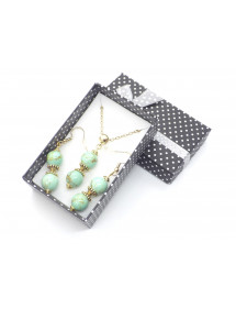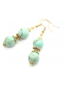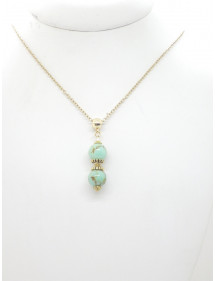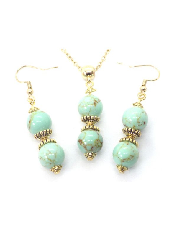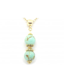Magnífica creación artesanal presentada por ThurColas Création, se trata de un conjunto de joyas compuesto por pendientes y un collar de acero inoxidable con colgantes de cuentas de turquesa reconstituidas con resina y teñidas de azul, cuentas tibetanas adornadas y copas de metal dorado. Estilo: Clásico, chic, Étnico, Bohemio Altura del colgante: 50 mm Largo del collar: 45 cm Alto Pendientes: 50 mm Ganchos: Francés Cuentas: 10 mm Materiales: Turquesa reconstituida azul, acero inoxidable bañado en oro, metal dorado Color: azul Color metal : Oro, oro Nuestras cuentas utilizadas para los colgantes de este conjunto de joyería compuesto por un collar y un par de aretes son de turquesa reconstituida y ensambladas sobre una varilla de metal dorado, el conjunto está montado sobre una cadena de acero y ganchos de acero inoxidable bañados en oro, la turquesa reconstituida. Al estar teñidas y veteadas al azar, cada cuenta es única en color por lo que puede haber ligeras diferencias con el modelo presentado, cada modelo es de hecho único. Esta joya viene con una bolsa de regalo gratuita.