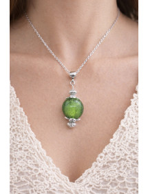 Collar artesanal con colgante de vidrio lampwork verde y latón plateado, estilo vintage