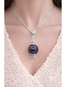 Collar artesanal con colgante de vidrio lampwork violeta y latón plateado, estilo vintage