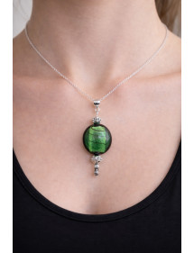 Collar artesanal con cuentas planas de vidrio lampwork verde y latón plateado, estilo vintage