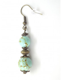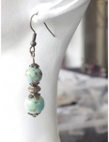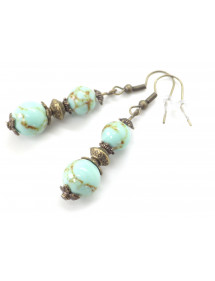 Una hermosa creación artesanal presentada por ThurColas Création, estos son aretes hechos de cuentas de turquesa reconstituidas con resina y teñidas de azul, adornadas con cuentas tibetanas y copas de latón de bronce antiguo. Todo está montado sobre ganchos franceses de latón. Perfectamente equilibrados con una altura total de 50 mm y un colgante de 35 mm, estos pendientes ligeros y cómodos están diseñados para ser elegantes y fáciles de llevar. Estilo: Clásico, Chic, Étnico, Bohemio Gancho: Francés Altura: 50 mm Cuentas: 10 mm y 8 mm Materiales: Turquesa azul reubicado, latón, bronce antiguo Color: azul Color del metal: bronce