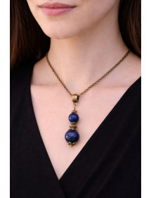 Estilo: Clásico, elegante, étnico, bohemio Altura del colgante: 35 mm Longitud del collar: 45 cm Cuentas: 10 mm y 8 mm Materiales: Azul Lapislázuli (piedra semipreciosa), latón, bronce antiguo Color: azul Color del metal: Bronce antiguo