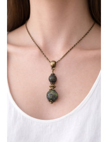 Estilo: Clásico, Elegante, Étnico, Bohemio Altura del colgante: 35 mm Longitud del collar: 45 cm Cuentas: 10 mm y 8 mm Materiales: Turquesa verde (piedra semipreciosa), latón, bronce antiguo Color: verde Color del metal: Bronce antiguo