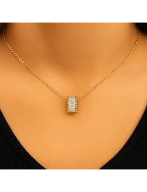 18,67 €Este collar contemporáneo presenta un colgante cilíndrico de 11 mm x 6,5 mm con circonitas talla baguette que reflejan intensamente la luz. Su cadena de acero inoxidable chapada en oro de 45 cm, con una extensión de 5 cm, permite un ajuste preciso para adaptarse a cualquier escote. Elaborada artesanalmente en nuestro taller de Anjou, esta pieza combina modernidad y elegancia para realzar tus looks de diario y de noche.