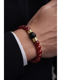 Pulsera de hombre muy bonita hecha con mimo en nuestros talleres de Francia. Esta pulsera está hecha de hermosas cuentas de cornalina roja natural, cuentas de ágata negra y cuentas tibetanas muy bonitas en latón dorado. Es la fuerza del metal lo que brilla en este modelo. Estilo: Étnico, Bohemio, tribal, Zen Longitud: 210 mm Cuentas: 10 mm y 12 mm Materiales: cornalina roja (piedra semipreciosa), ágata de latón negro Color: rojo, negro Color del metal: Dorado Magnífica pulsera compuesta por cuentas naturales en cornalina roja (piedra semipreciosa), ágata negra y cuentas tibetanas en latón dorado, todas montadas en un hilo elástico de calidad. Esta pieza de joyería viene con una bolsa de regalo de color dorado gratis.