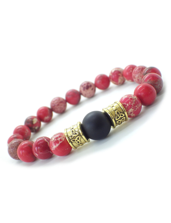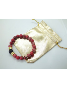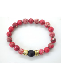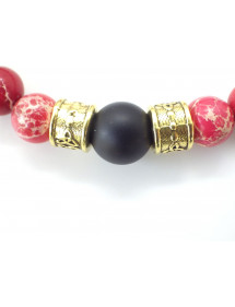 Pulsera de hombre muy bonita hecha con mimo en nuestros talleres de Francia. Esta pulsera está hecha de hermosas cuentas de jaspe imperial rojo natural, cuentas de ágata negra y cuentas tibetanas muy bonitas en latón dorado. Es la fuerza del metal lo que brilla en este modelo. Estilo: Étnico, Bohemio, Tribal, Zen Longitud: 210 mm Cuentas: 10 mm y 12 mm Materiales: Jaspe Imperial (Piedra Semipreciosa), Ágata Negra Color de latón: Rojo, Negro Color del metal: Dorado Magnífica pulsera compuesta por cuentas naturales en jaspe imperial rojo (piedra semipreciosa), ágata negra y cuentas tibetanas en latón dorado, todas montadas en un hilo elástico de calidad. Esta pieza de joyería viene con una bolsa de regalo de color dorado gratis.